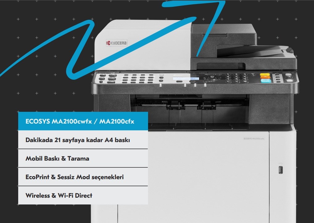 Bu giriş seviyesi profesyonel çok fonksiyonlu Kyocera ECOSYS MA2100cfx renkli fotokopi makinesi tüm iş gereksinimlerini karşılar. Tarama, kopyalama, faks ve mobil tarama işlevleri, optimize edilmiş bir iş akışı sağlar.