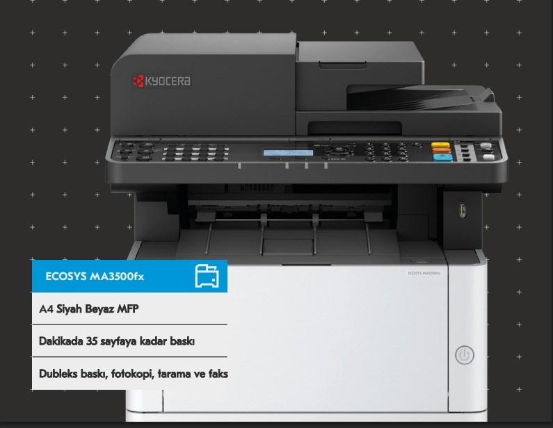 Kyocera ECOSYS MA3500fx, gelişmiş güvenlik ve enerji tasarrufu özellikleriyle yazdırma, tarama, kopyalama, faks işlemlerini verimli bir şekilde gerçekleştirir. Yüksek ilk baskı hızı ve mobil baskı desteği sayesinde yoğun iş ortamları için ideal bir çözümdür.