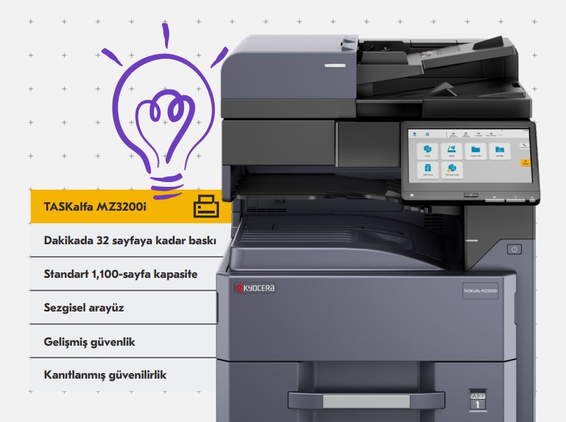 Dakikada 32 sayfa A4 baskı hızına sahip siyah beyaz çok fonksiyonlu fotokopi makinesi Kyocera TASKalfa MZ3200i, gelişmiş işlevsellik, kullanılabilirlik ve özelleştirilebilir çözümlere sahip küçük ofisler ve çalışma grupları için mükemmeldir.