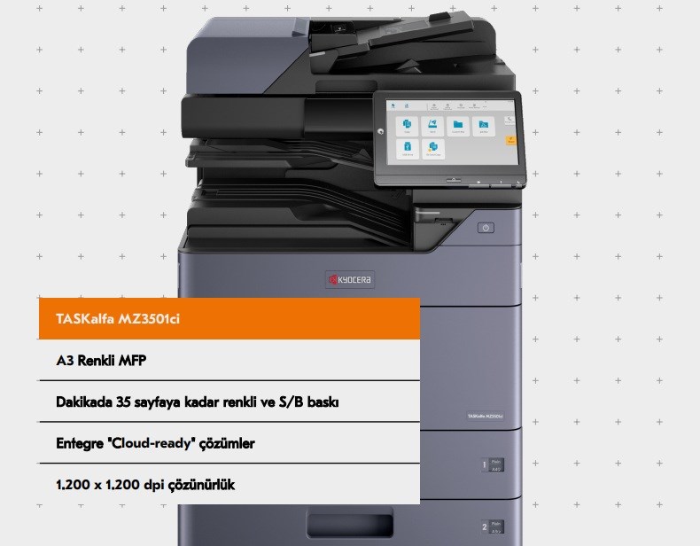 Gelişmiş yapay zeka teknolojileri ve en yüksek güvenlik standartlarıyla donatılmış Kyocera TASKalfa MZ3501ci renkli fotokopi makinesi ile mükemmel doküman yönetiminin avantajlarından tam anlamıyla faydalanın.